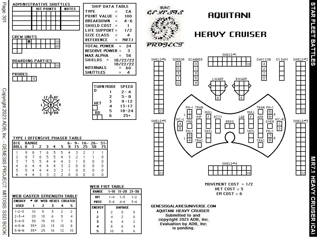 MITOSIS AQUITANI SHIPS (MR7.1) AQUITANI HEAVY CRUISER (CA) The Aquitani Heavy Cruiser was a maneuverable starship that bore the brunt of the Aquitani workload. Armed with Eight Offensive Phasers and Four Web Casters, the Aquitani was avoided because of its unusual Web Tactics. Opponents would find the Aquitani…